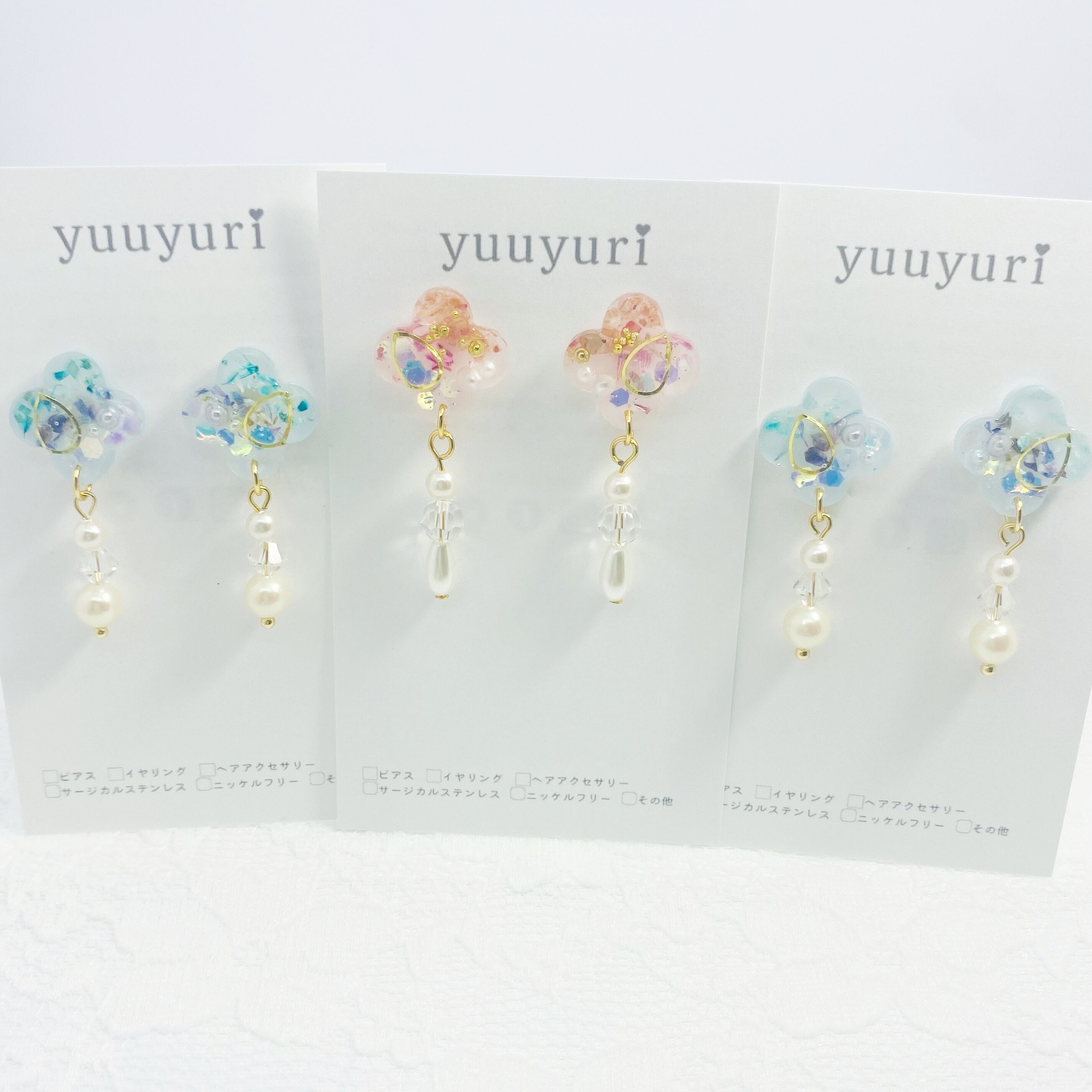 レジン素材に、透明感のあるオーロラフィルムを重ねることで、光があたるたびに美しく輝きます。