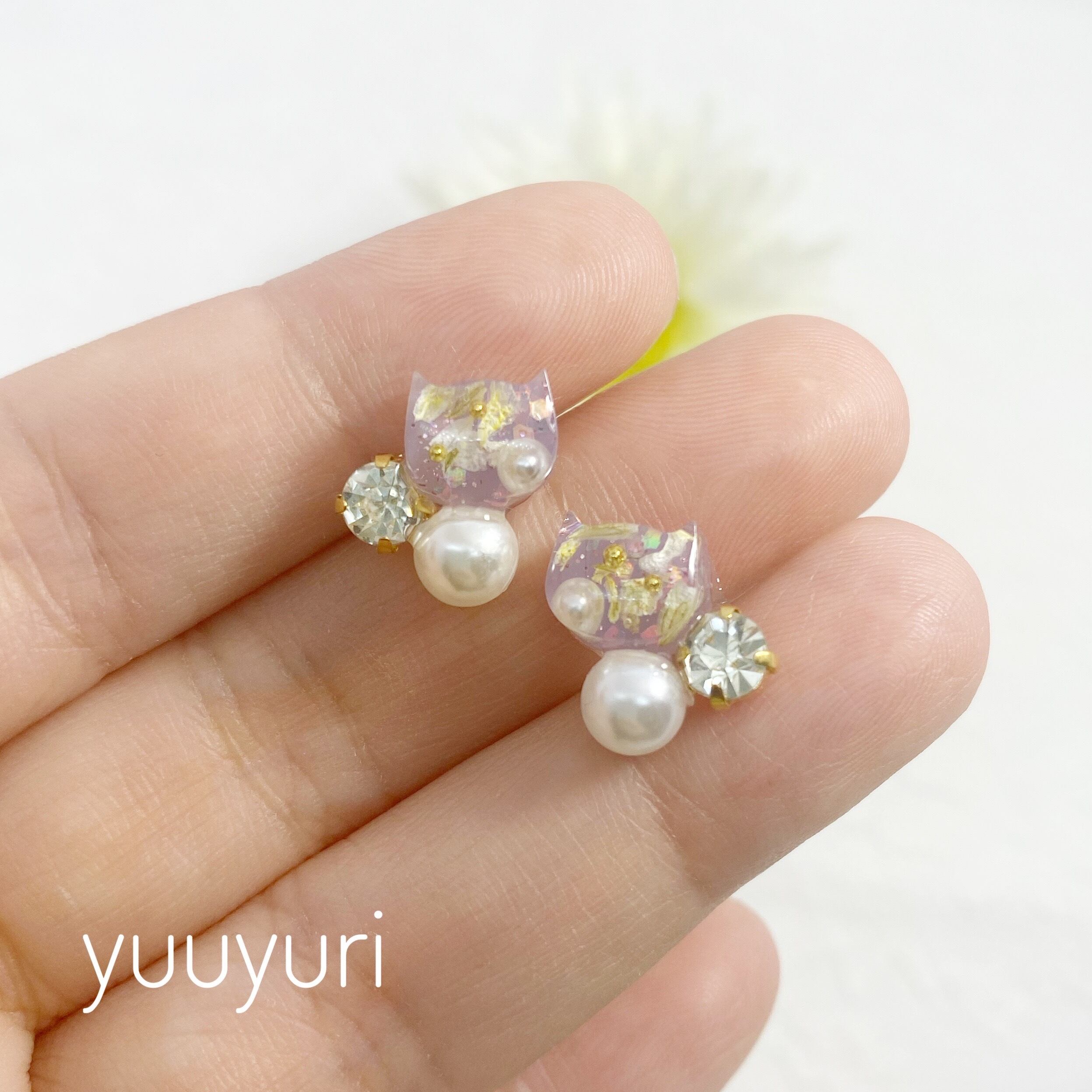 猫モチーフの下側のパール(又は淡水パール)は体に見立て、隣りに添えられたガラスビジューは煌めくしっぽに見立てています。